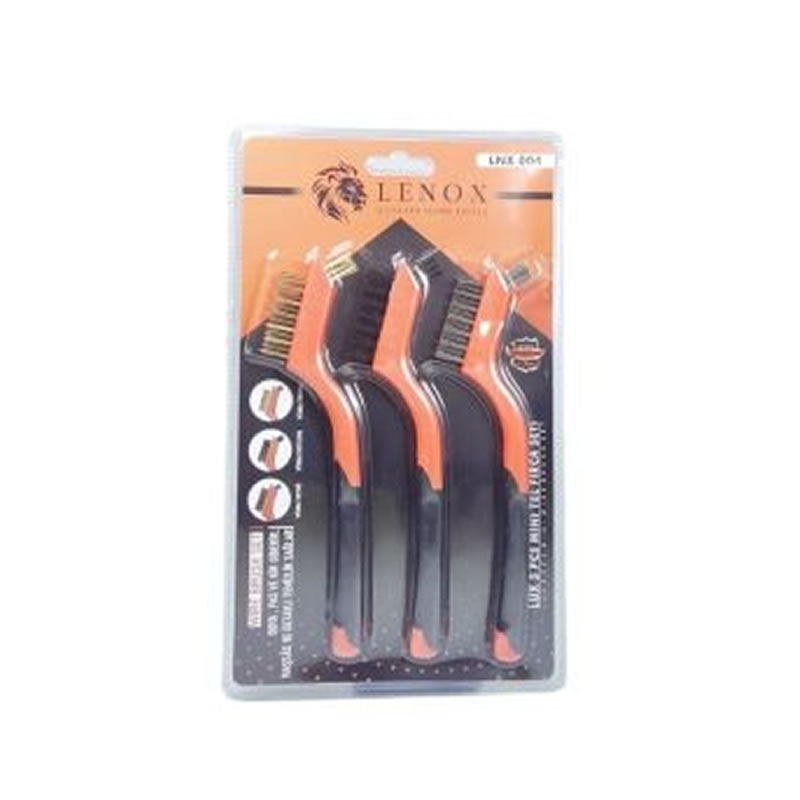 Lenox LNX004 Seti, temizlenecek yüzeyin sertliğine göre seçebileceğiniz üç farklı fırça ucundan oluşur. Diş fırçasına benzeyen ergonomik yapısı sayesinde, büyük tel fırçaların ulaşamadığı girintilere, köşe birleşimlerine ve hassas mekanik parçaların arasına kolayca nüfuz eder. Lüx serisi olması sebebiyle tellerinin dökülme direnci yüksektir ve sap kısımları yoğun baskı altında esneme yapacak dayanıklılıktadır.